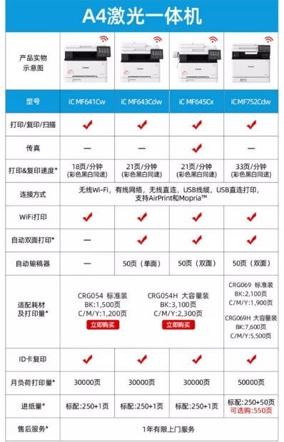 型号MF441dw【速度33页/分钟 四合一】,MF443dw【速度38页/分钟三合一】,MF449dw【速度38页/分钟 四合一】,MF543dw【速度43页/分钟 四合一】,MF264DWii【速度28页/分钟 三合一】